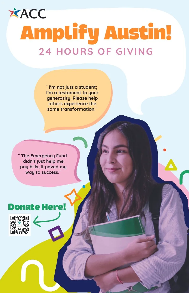 The goal of this project was to design promotional material for ACC’s Amplify Austin campaign. This campaign will raise funds for ACC’s emergency student fund, providing students with aid and necessary help.