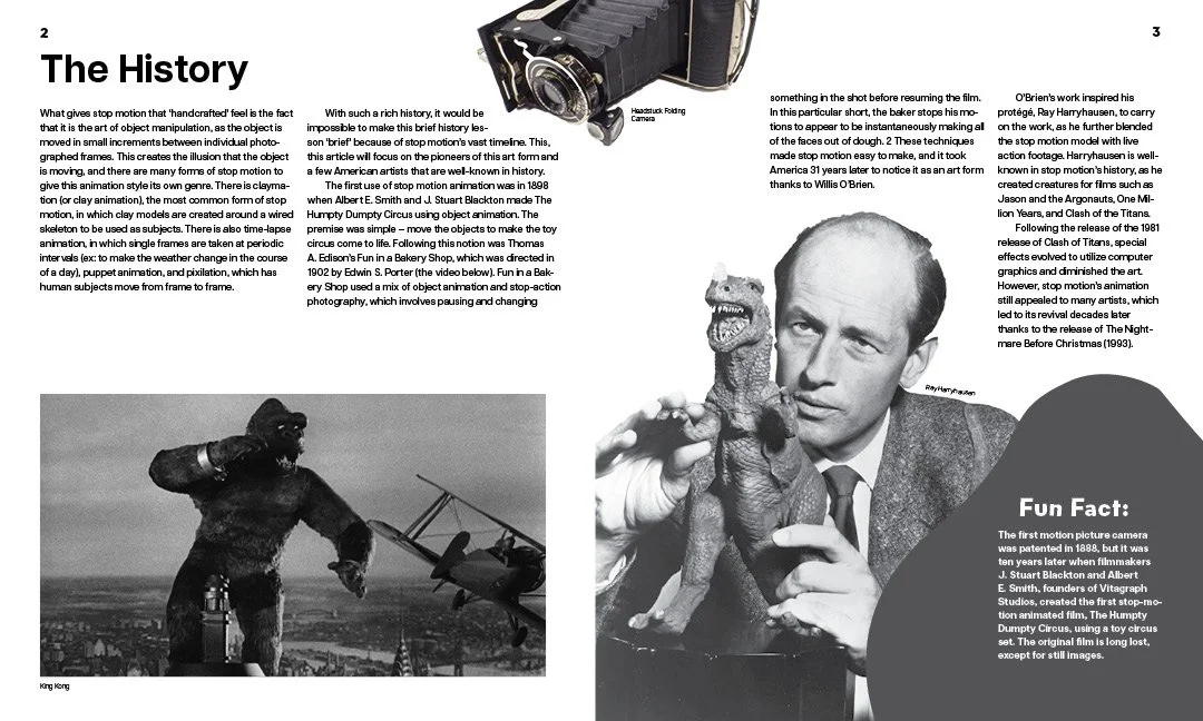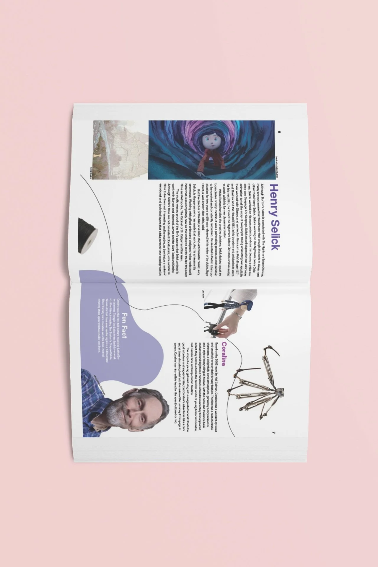My goal with this project was to create a booklet with an effective layout and flow. I wanted to showcase how stop motion came to be and who are some of the popular stop motion creatives.
