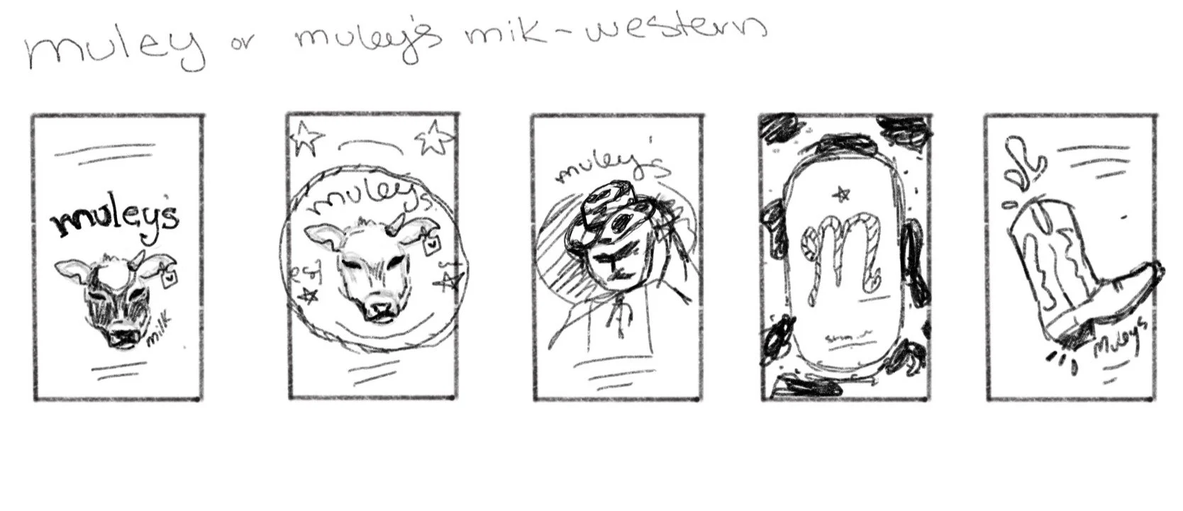 At the beginning of my sketching process, I had to choose my brand name. I chose Muley’s: a one-horned or hornless cow. I chose this because it was both a Western slang term and also symbolized uniqueness which I wanted with this brand.